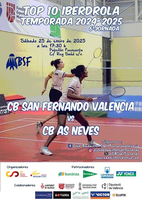 Adjuntamos la previa de la 6a Jornada de la liga TOP10 Iberdrola de bádminton que se jugará el próximo SÁBADO 25 de ENERO a las 17:30 horas en el Pabellón Municipal Fuensanta (Valencia), donde se enfrentará nuestra entidad, el Club Bádminton San Fernando Valencia, contra el CB As Neves, ansiosos por sumar los 3 primeros puntos.